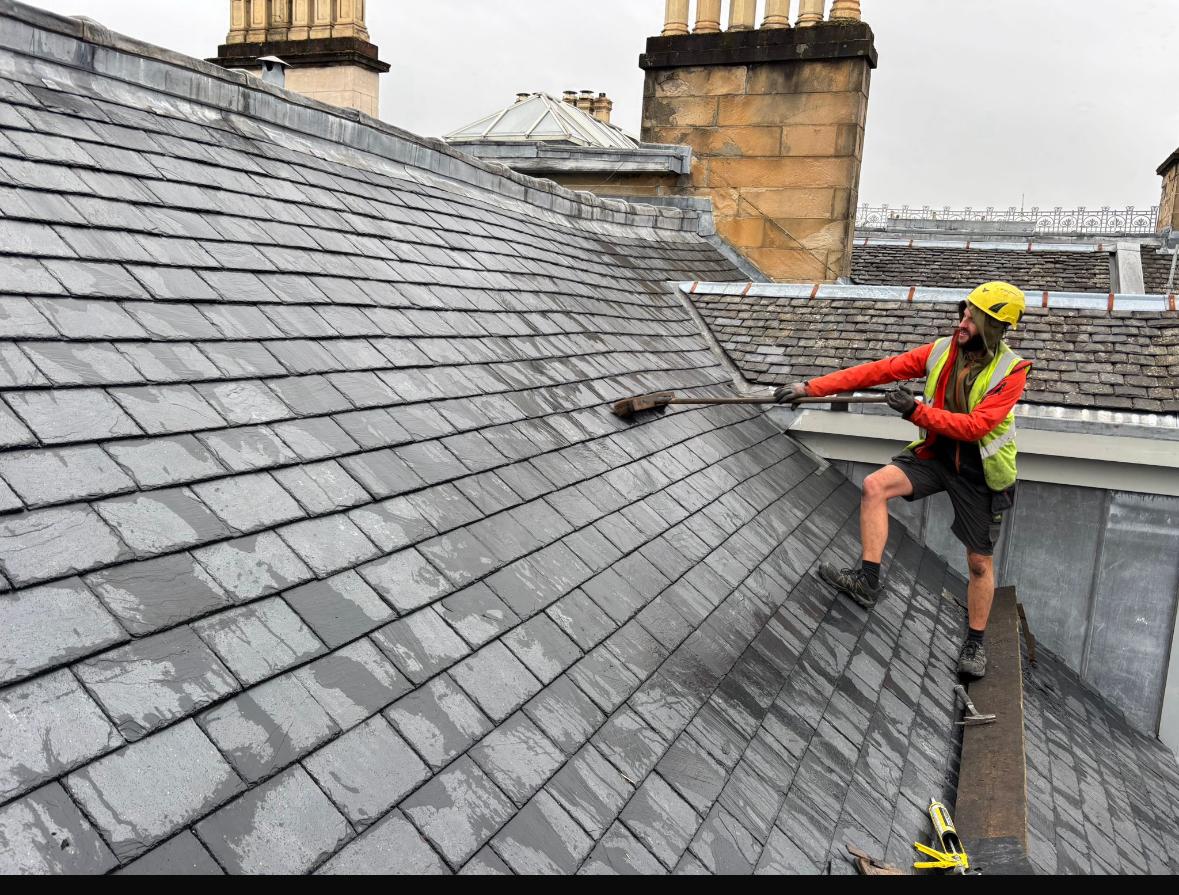 3 full panels approximately 250m2 of scotch slate was removed the sarking boards that were rotten and replaced with like for like, then new 1F felt was installed and new lead valleys before being slated back up with Cupa H3 slates.